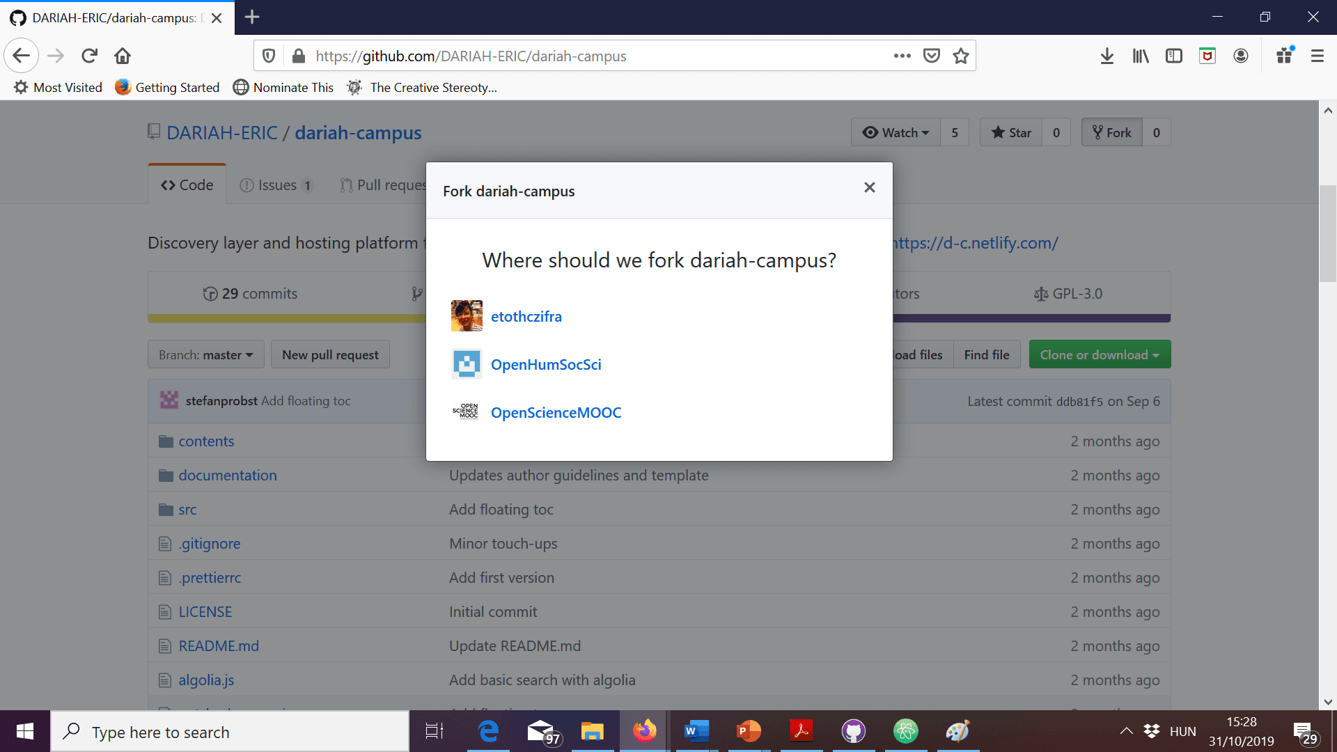 - If you are a contributor to various organizational repositories, GitHub may ask you to select where you would like to fork dariah-campus. Make your choice.