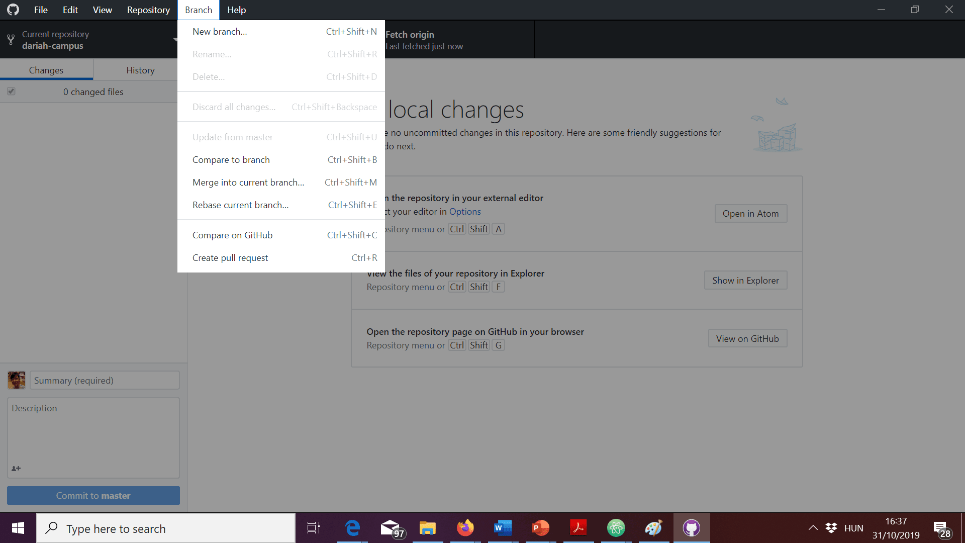 Open GitHub Desktop and make sure you have no uncommitted changes in the Changes tab.