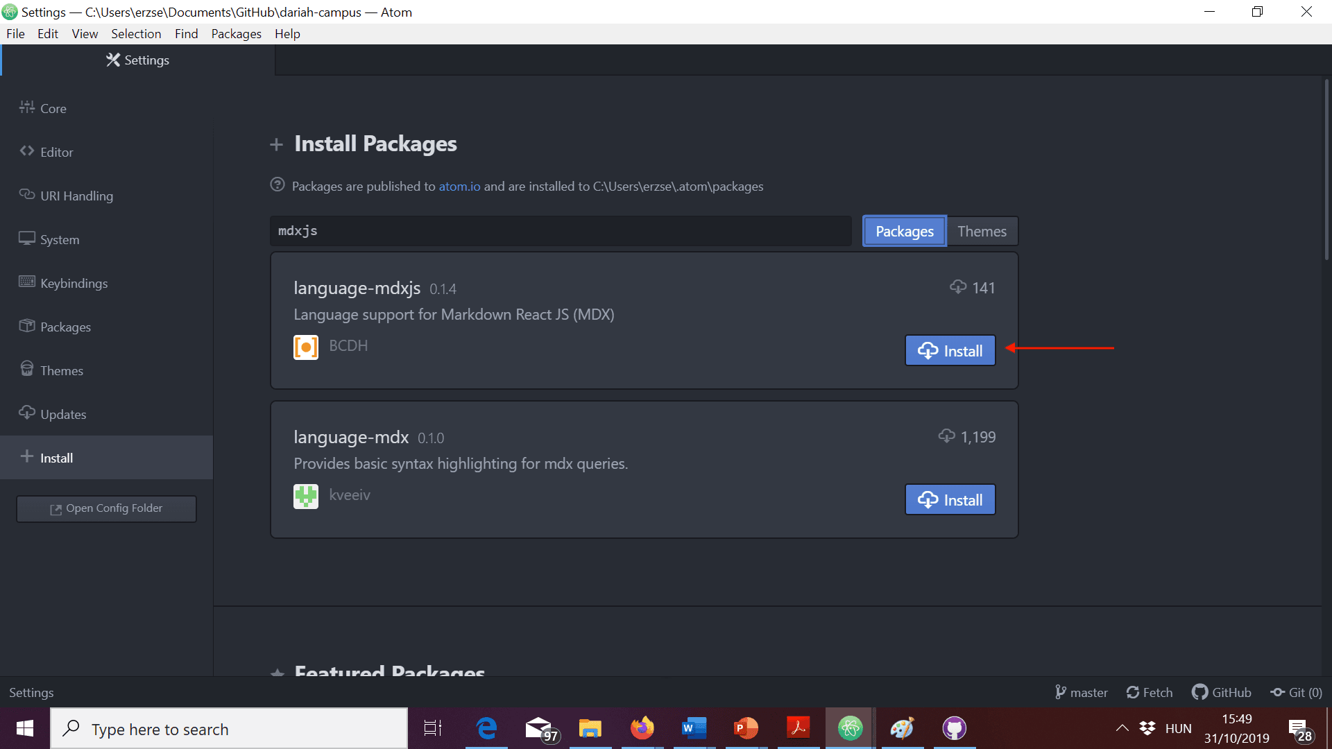 - Make sure the “Packages” tab next to the search field is selected. Then type “mdxjs” in the search field and wait for results to show up. You should see a package called language-mdxjs in the results. Click on install.