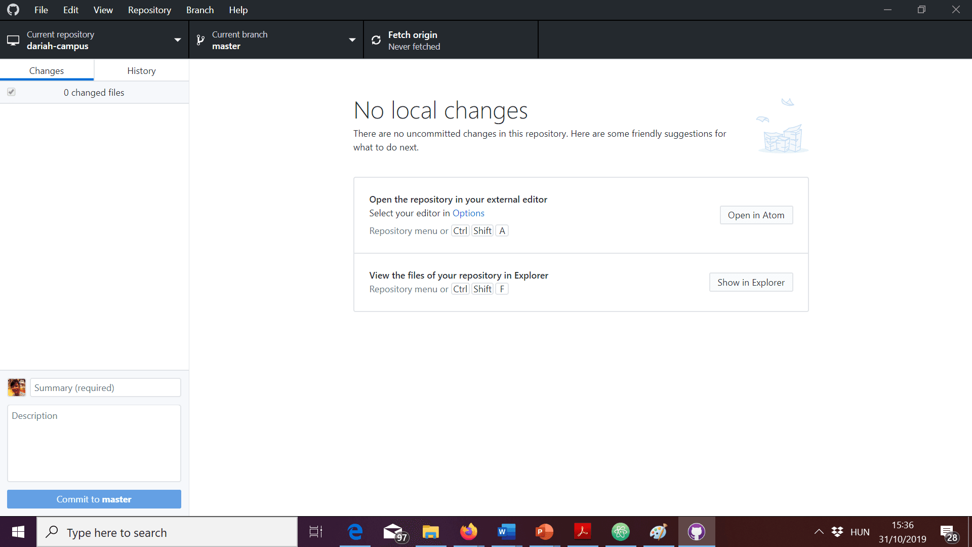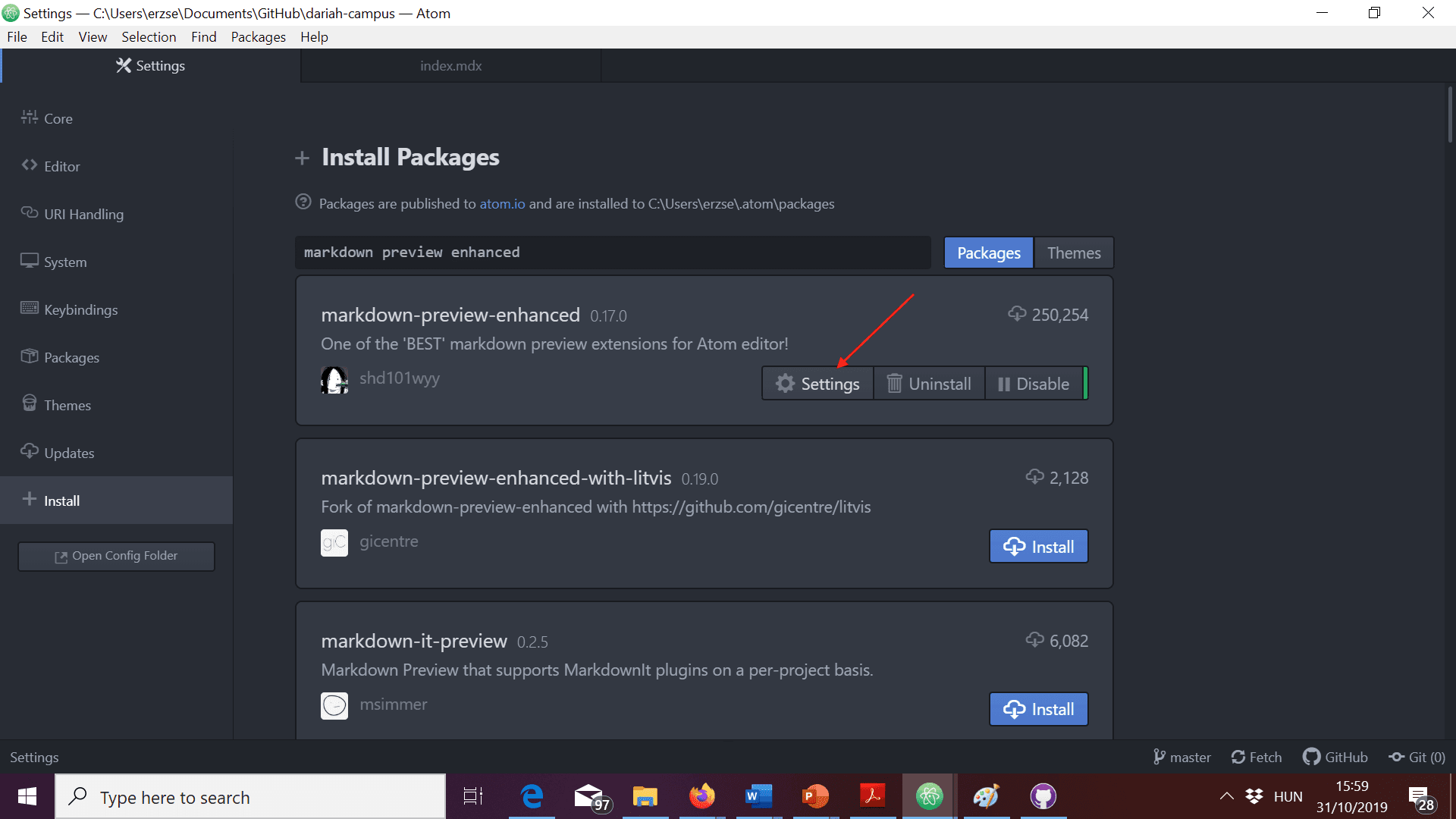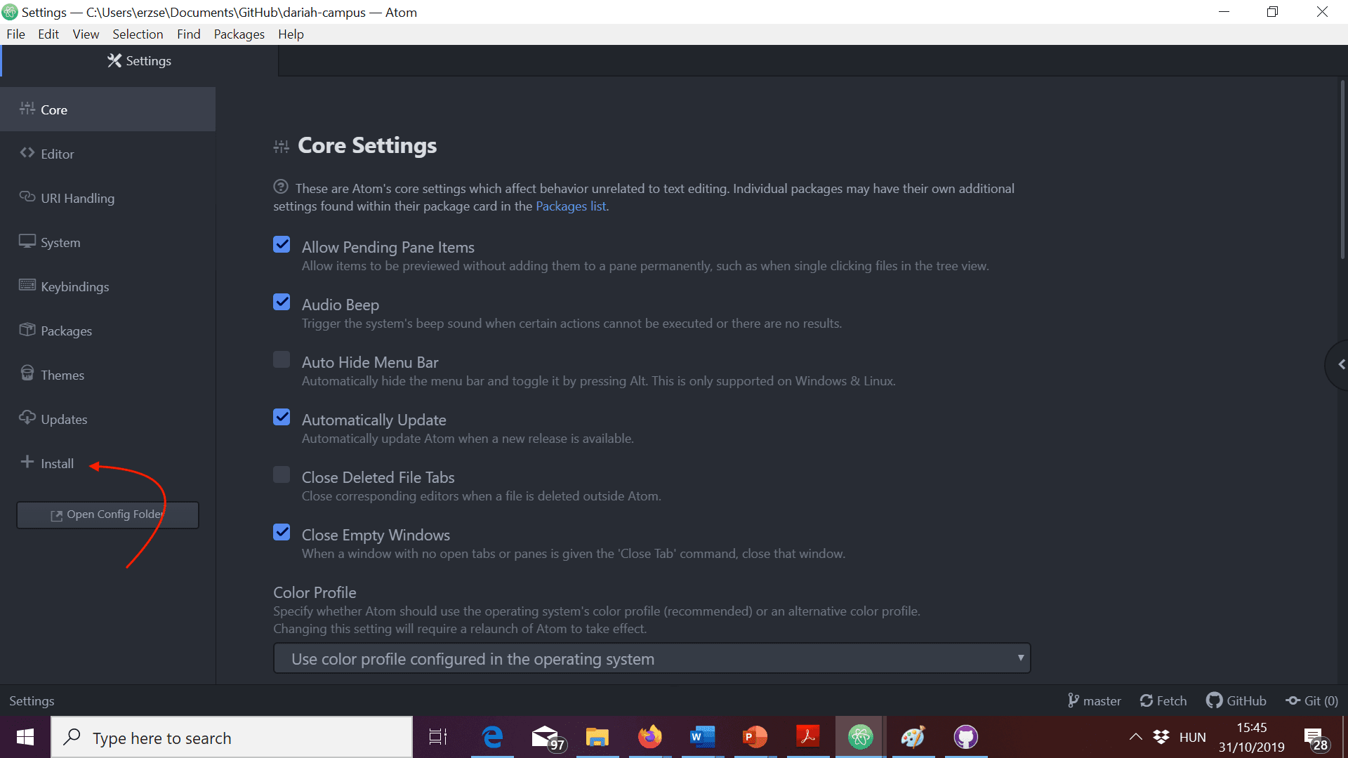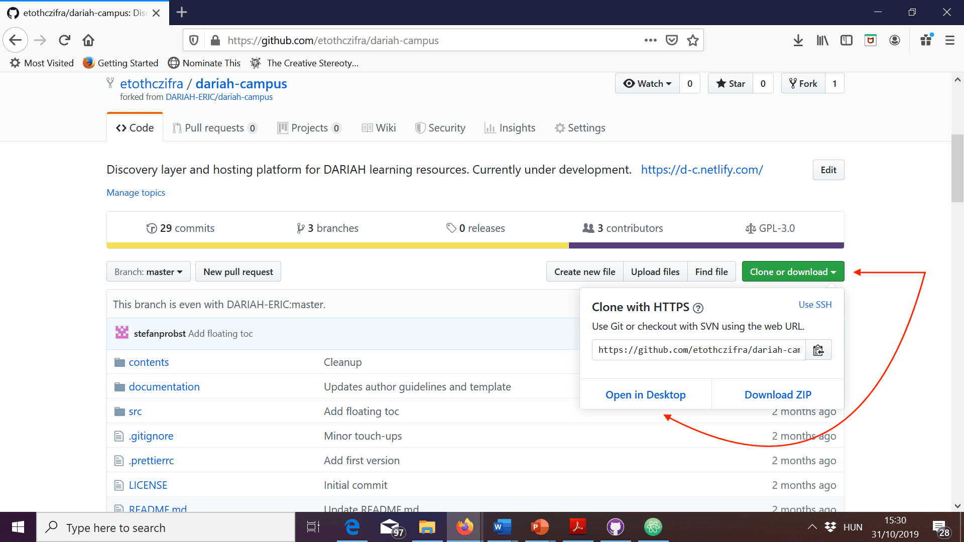 - To get to the folder with DARIAH-CAMPUS on your computer, click on Open in Atom (or your preferred editor, if you already set it up).