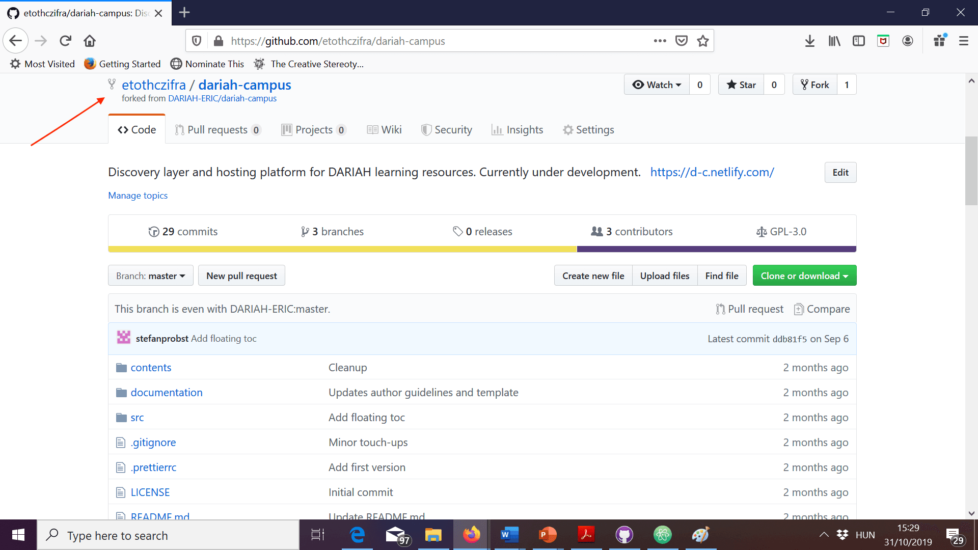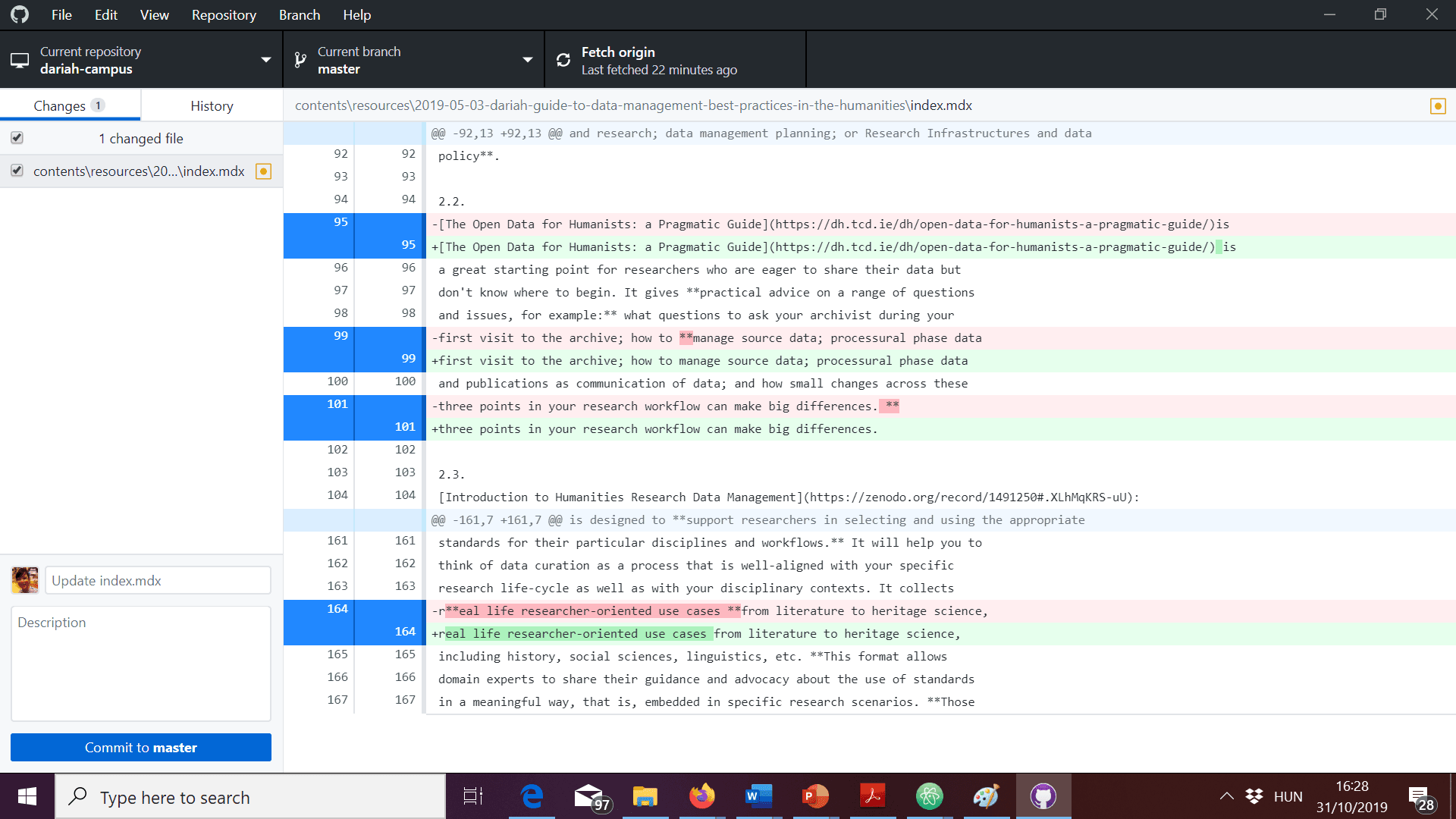 This will update your local fork with the changes that may have been submitted to the “upstream” DARIAH-CAMPUS, i.e. the original repository owned by DARIAH. - Do your work.