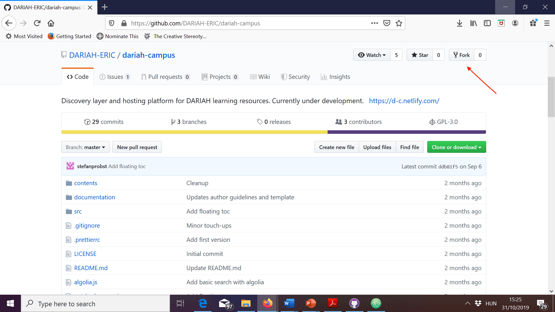- In your browser, go to https://github.com/DARIAH-ERIC/dariah-campus and click on “fork”.