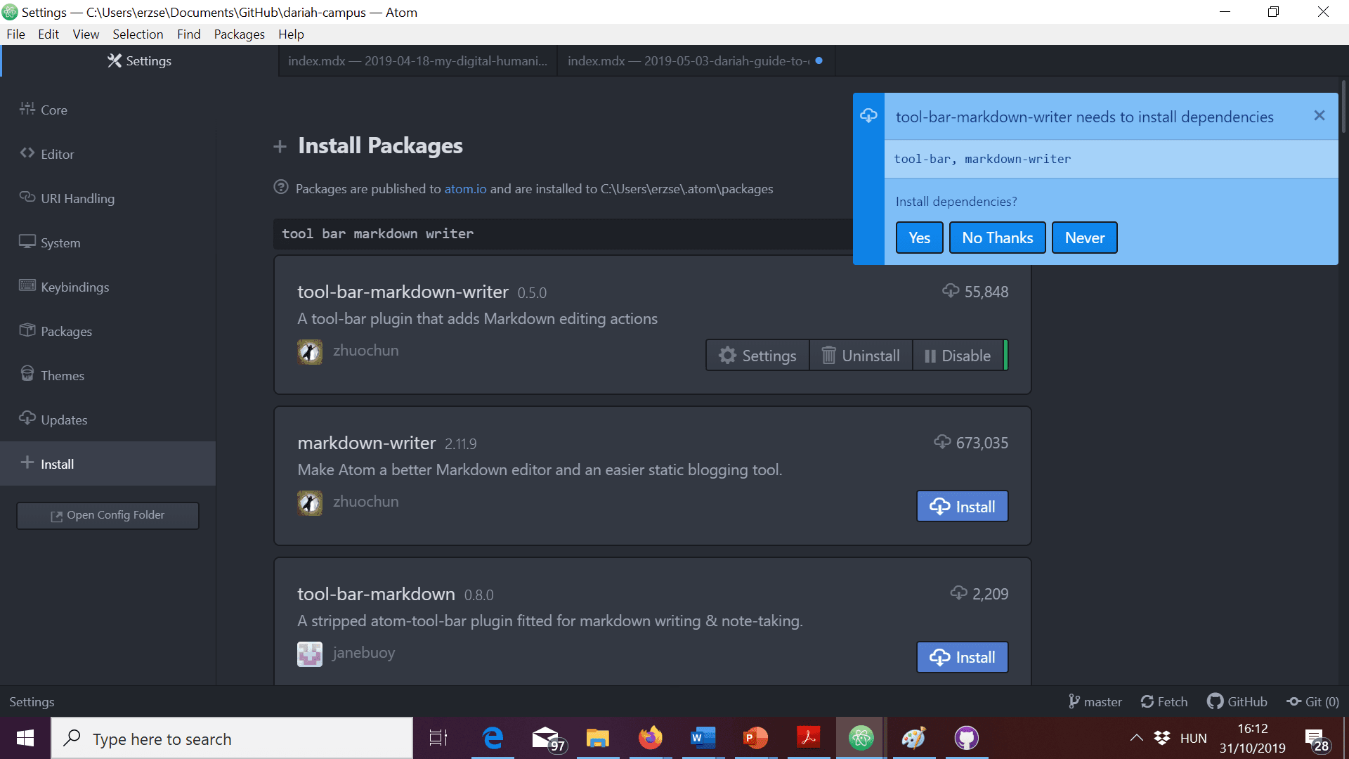 - Atom will ask you if you want to install dependencies, click on “Yes”: