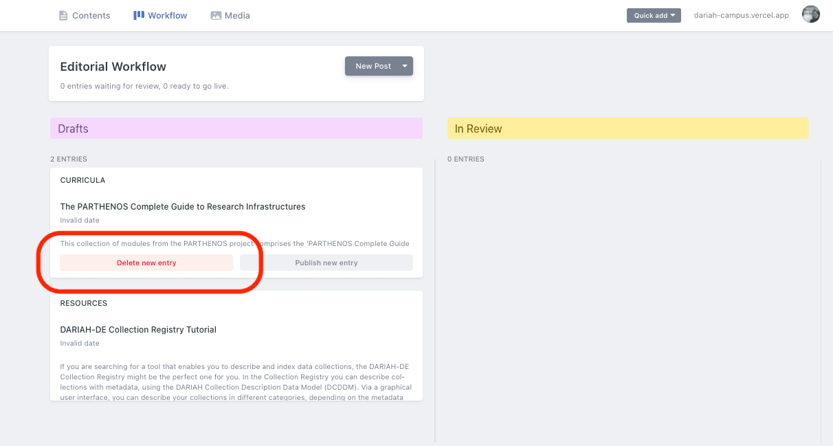 When you are ready to send your curriculum for review to publish, you can then click on ‘Workflow’ to bring you to the two-panel screen showing your current drafts and your items that are under review. At this point you can click on a draft to make any further changes you need to. You also have the option to delete a resource if you no longer want it.