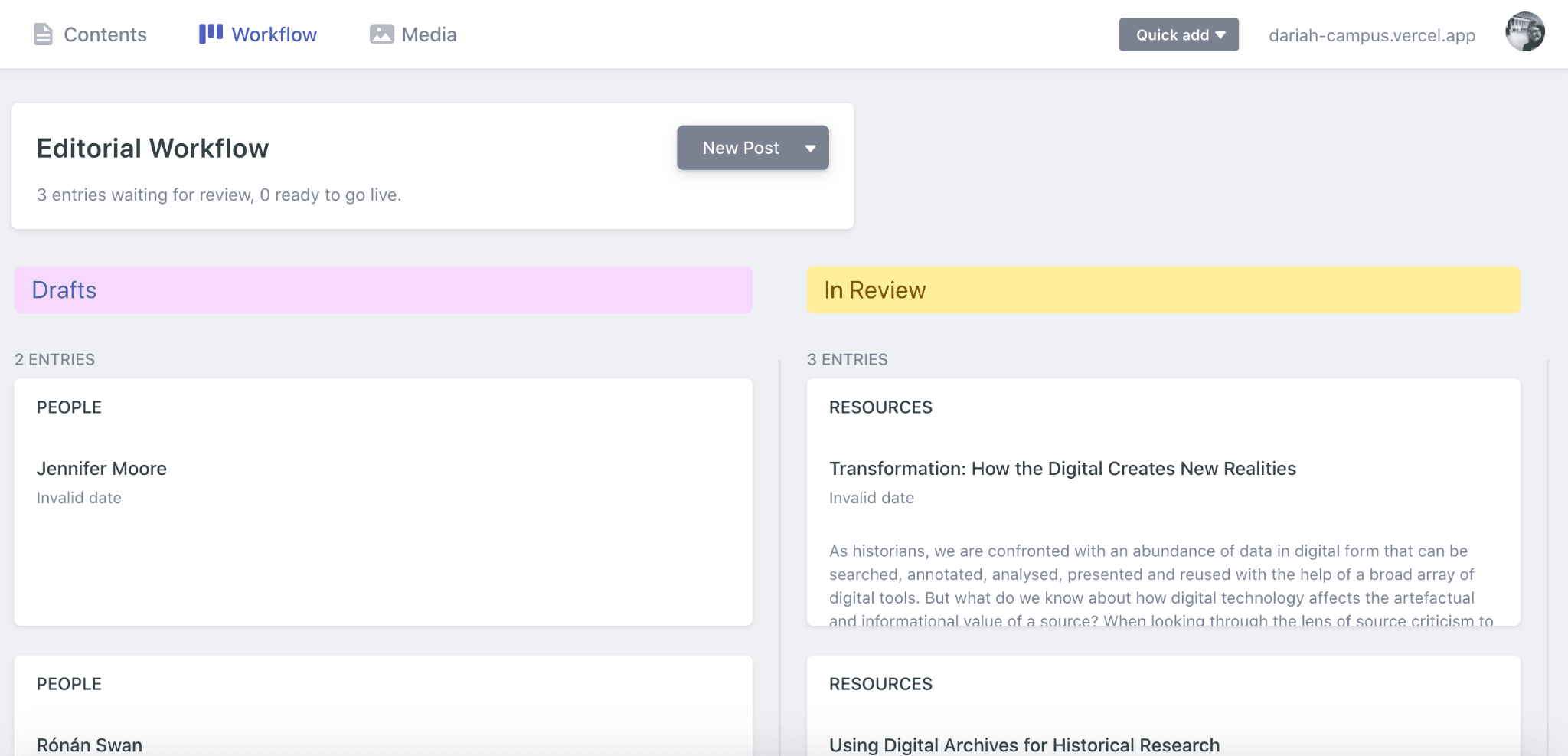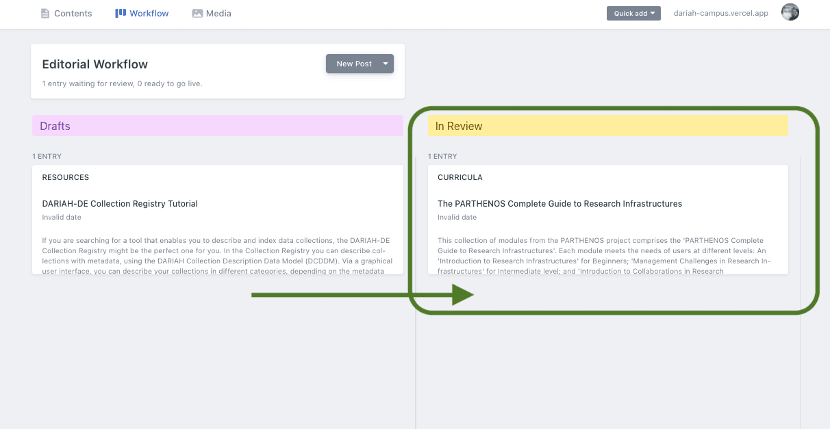 1. After either step 2a or 2b, you can check in on your new resource (draft or in review) by clicking on the ‘Workflow’ menu option along the top bar. This will bring you through to the ‘Editorial Workflow’ space, where you can look at your current drafts, and also your items in review.
