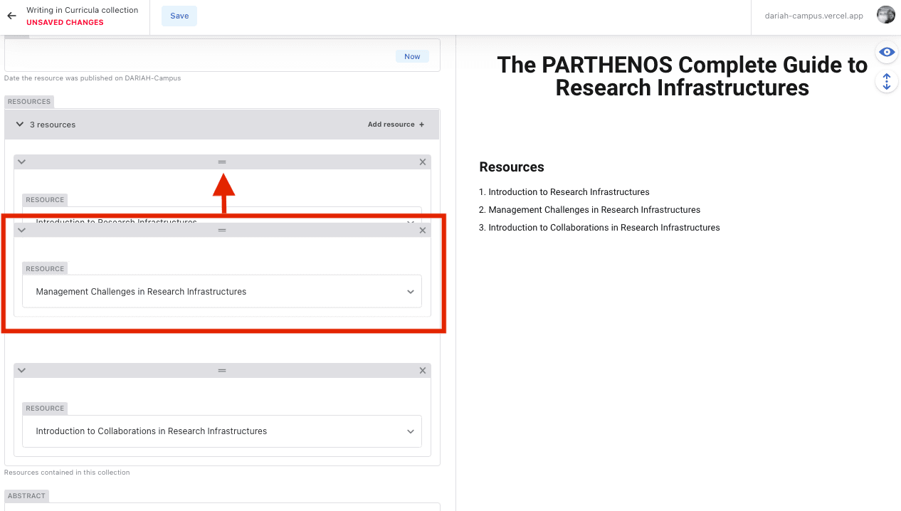 2b) If you have other things to work on, or for any reason want to check back on another resource you have created, you can click on the arrow in the top left-hand corner. Make sure that the message next to the arrow says ‘CHANGES SAVED’. If you have left one of the required fields blank, this will tell you with an error and mark the required field border as red.