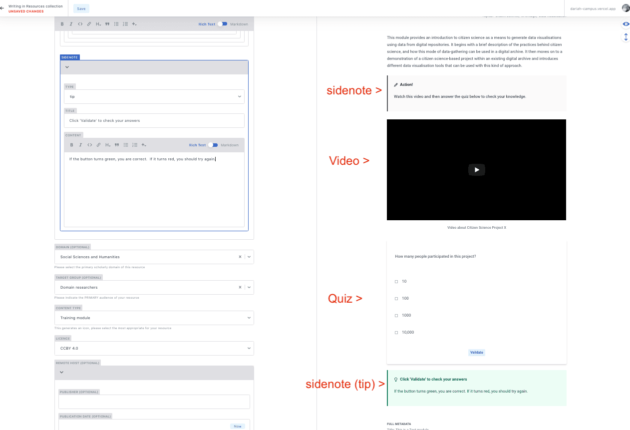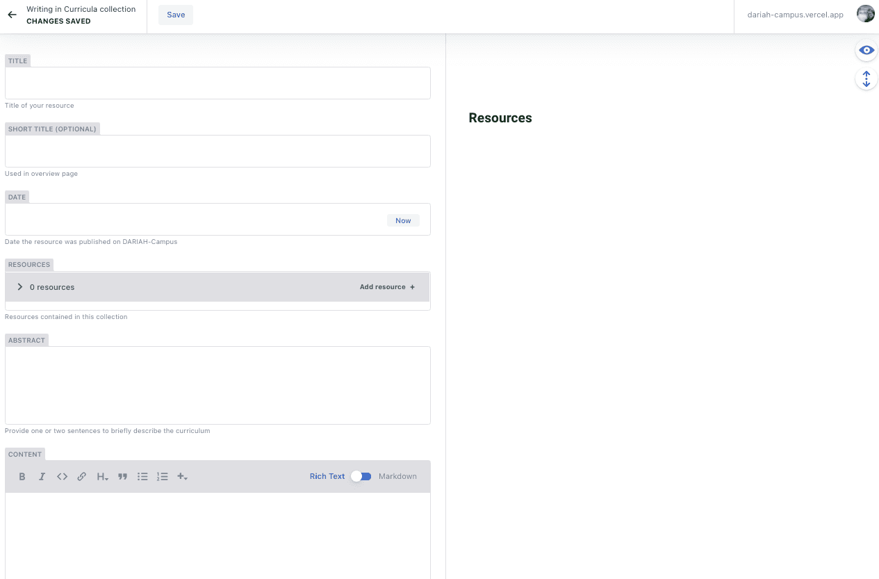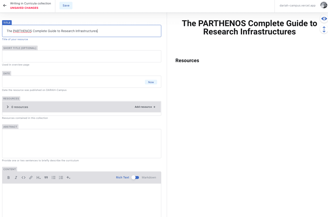 2. This will bring you to a page with a form with two columns: a form on the left hand side, and a preview panel on the right. As you add items, you will see that the preview panel will start to display them so you can see how they will show up on the main DARIAH-Campus site.