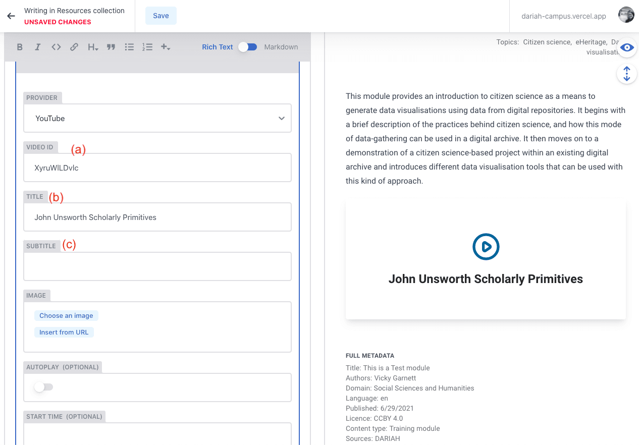 The ‘Video’ option is a bit different to the ‘Video Card’ option as it allows you to embed a video within the content of the resource you are writing. This is particularly useful if you are creating a new ‘Hosted’ resource directly on DARIAH-Campus, and want to embed a video to illustrate or demonstrate an issue or provocation.