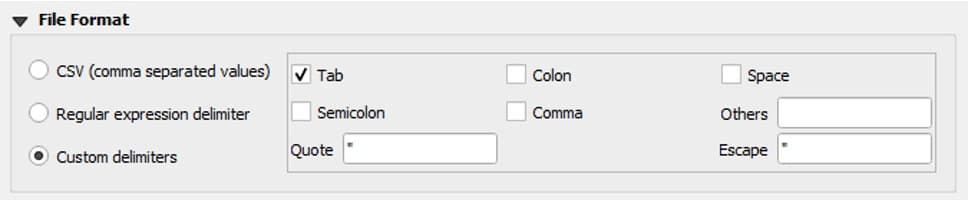 As in step 1c, you can add this new text file to QGIS by selecting Layer > Add Layer >Add delimited text layer and locating the GB_Gaz file. This time, however, we need to tell QGIS that this is a tab delimited file (rather than comma delimited). To do this, simply select Custom Delimiters under the File Format section, then select Tab. Click to add this data when you’re ready.