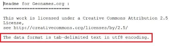 This interface is intended to aid users who wish only to look up information on a particular place; however, it is also possible to download all of the data for a particular country. In this practical, you will use the GeoNames ‘country file’ containing entries for the UK, GB.txt. This has already been downloaded to the DARIAH-GTA.zip file for you. Other country’s data is available by following the link to Free Gazetteer Data under the Download heading_._