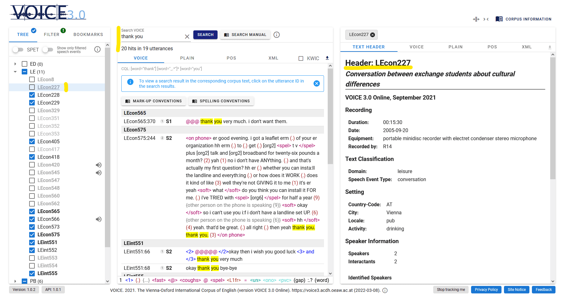 The buttons above the right-hand area are especially useful: the big button “Corpus information” gives you access to more extensive PDF manuals, like the search manual and the VOICE transcription conventions. The two symbols next to “Corpus information” allow you to adjust the display settings: with the left icon, you can merge colons, the right icon allows to adjust the display to a narrow screen (e.g. for a mobile phone). Clicking on the same icon again brings you back to the default view. The new VOICE 3.0 Online interface provides many integrated tool tips, pop-ups and links to more extensive PDFs with corpus documentation. The goal has been to design an interface that is easy and intuitive to navigate and immediately provides short explanations to the user, while also offering links to more extensive guidelines where useful or necessary.